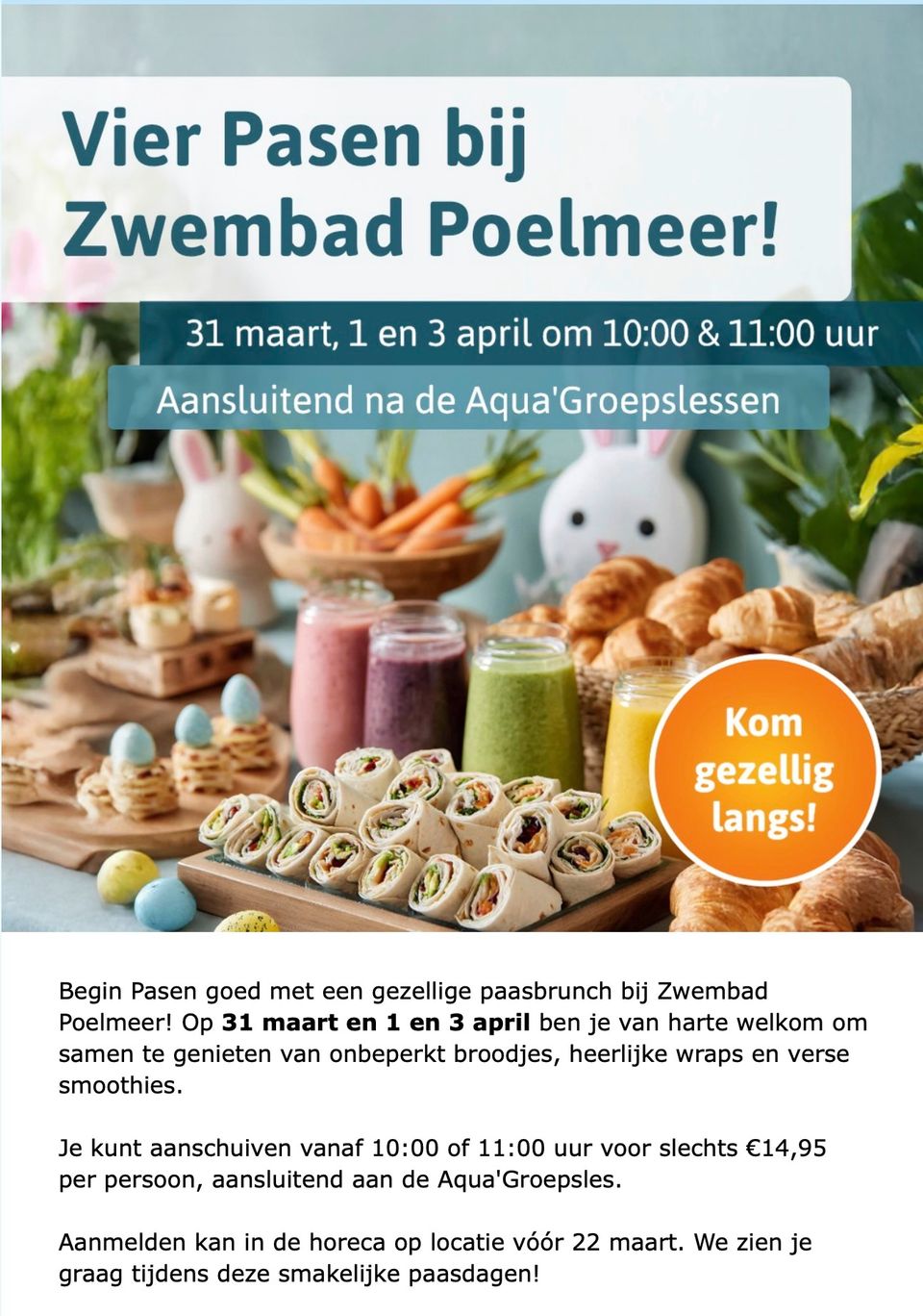 Begin Pasen goed met een gezellige paasbrunch bij Zwembad Poelmeer! Op 31 maart en 1 en 3 april ben je van harte welkom om samen te genieten van onbeperkt broodjes, heerlijke wraps en verse smoothies.