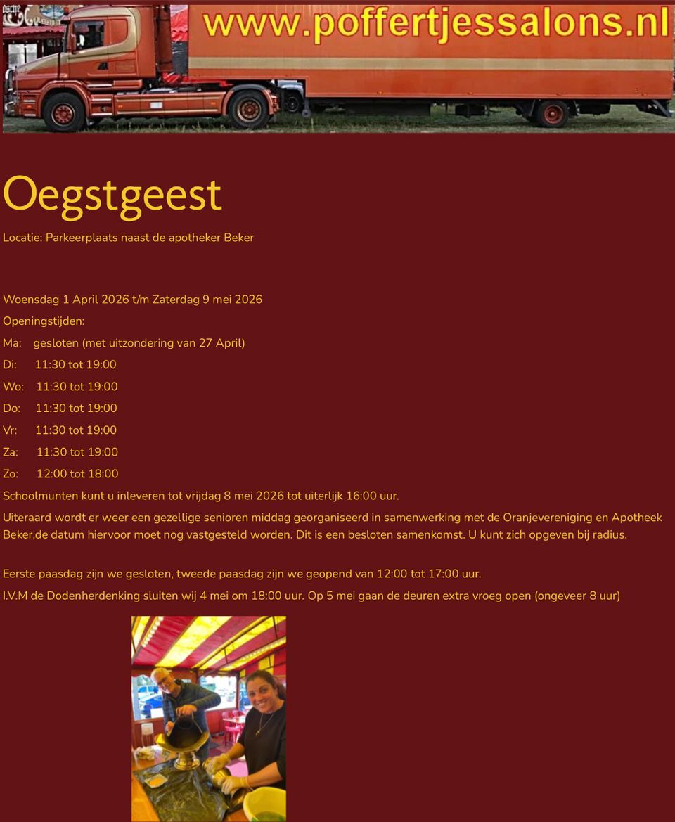 Op de parkeerplaats naast Apotheek Beker staat weer als vanouds de Poffertjeskraam.